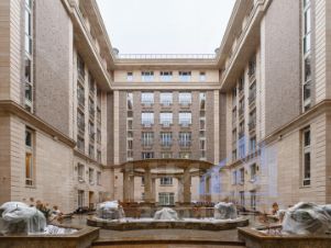 просторная кухня-гостиная с высокими потолками и панорамными окнами.