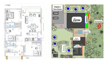 1 этаж: гардеробные, кабинет, с/у, гостиная, кухня, столовая, холл, 2 камина, гараж на 2 машины.