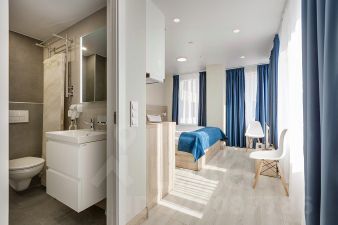 В ванной комнате установлена сантехника, душевая кабина, раковина с тумбой, зеркало, фен и полотенцесушитель. ВСЁ ОСТАЕТСЯ в апартаменте для вашей комфортной жизни или быстрой сдачи в аренду самостоятельно или через управляющую компанию