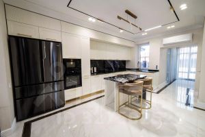 Небольшое описание меблировки дома, которое приведет Вас в восторг при личном посещении: кухонный гарнитур, сделанный на заказ, оборудован встроенной бытовой техникой, таких фирм как Samsung, AEG, Haier, столешница кухонного гарнитура выполнена из природного камня, кухонная раковина из камня оборудована измельчителем, обеденный стол изготовлен из мрамора, покрытого защитной пленкой. Вся мебель в доме изготовлена в студии Арт-мебель по индивидуальному дизайн - проекту.