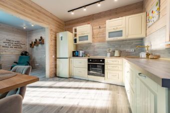 • кухня 16,87м² - современная кухонный гарнитур со встроенной техникой (электрическая варочная поверхность, электрический духовой шкаф, посудомоечная машина, холодильник), большая обеденная зона (стол и 8 стульев);