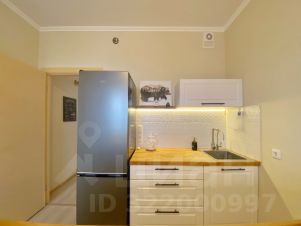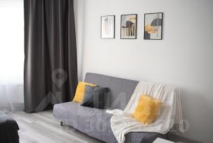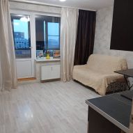 Большая кухня-гостиная с кухонным гарнитуром и современной бытовой техникой, большой комфортный угловой диван, стол, стулья, тумбочка под телевизор. Из кухни есть выход на лоджию. Две изолированные комнаты: 16 и 14 метров. В спальне большая кровать, туалетный столик. Окна выходят во двор, вид на лес. КУ летом: 5000 зимой: 8000 примерно.