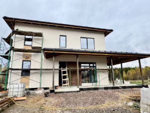 Дом 165 м2 из газобетона 400 мм, на фундаментной плите 300 мм. Фасад: штукатурка и натуральный планкен.