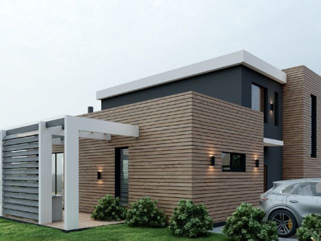 Компактный проект VE-50 для небольшой семьи совмещает в себе все, что нужно для комфортной жизни. Дом выполнен в cовременном стиле,фасады облицованы штукатуркой с фрагментами деревянных планок. В доме предусмотрено 3 спальни, уютная гостиная с выходом на терассу и компактная кухня.