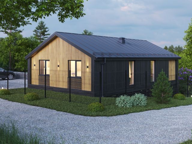 Представляет собой стильный одноэтажный дом с двускатной кровлей, удобной планировкой и высотой потолков 3 метра.