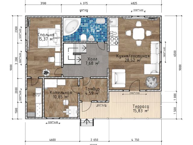 Общая площадь дома по проекту «Дюна» 90.43 м² без учёта террасы.