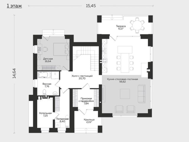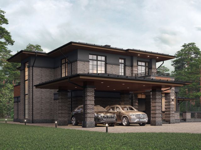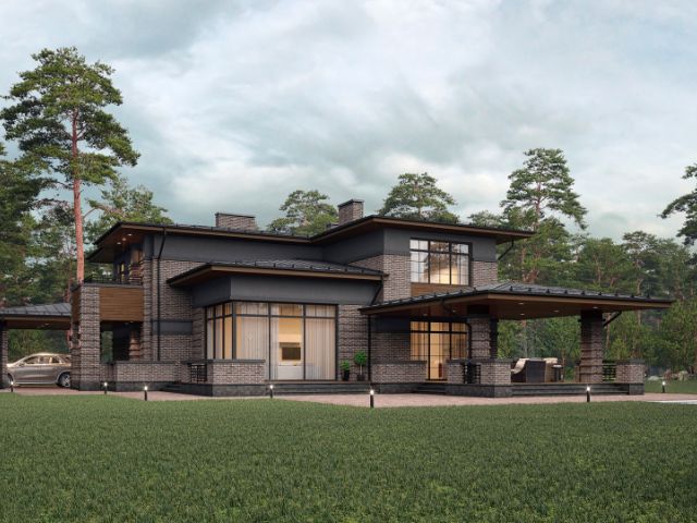 Проект современного одноэтажного дома "Аврора 6" в скандинавском стиле с двумя открытыми террасами, террасой-барбекю, сауной и навесом для автомобиля. Площадь дома - 309,03 кв.м.