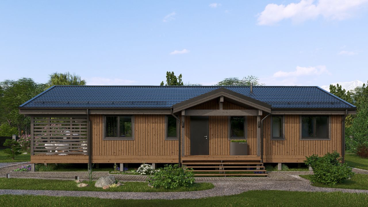 В доме можно жить круглый год. Изготовлен по технологии "префаб". Домокомплект производится на заводе в виде готовых панелей стен, кровли, пола, которые затем монтируются на участке. Такая технология обеспечивает высокие теплоизоляционные свойства, а также долговечность и надежность конструкции.