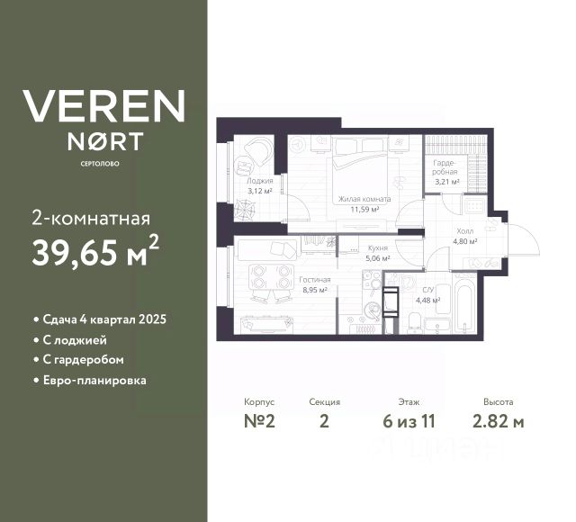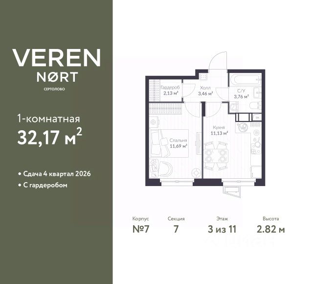 Успейте забронировать по акционной цене! Предложение ограничено! Стоимость квартиры указана со скидкой, ваша экономия составит 2,107,756 RUB. Информация по телефону, наши менеджеры вам все расскажут! Просторная однокомнатная квартира в Veren Nort Сертолово на 7 этаже. Квартира без отделки, после выдачи ключей можно делать ремонт. Общая площадь: 41.47 кв.м., жилая: 13.94 кв.м., площадь просторной куxни-гостиной: 18.79 кв.м. Квартира угловая, идеально подойдет любителям тишины и панорамных видов. В квартире один балкон, один совмещенный санузел. Высота потолков 2.82 м. Квартира находится в корпусе 2. Дом монолитный, одноподъездный, высотой 11 этажей. На этаже 14 квартир. В подъезде 1 пассажирский и 1 грузовой лифт. Начало строительства - 3 квартал 2023 года. Окончание строительства - 4 квартал 2025 года. Оформление сделки по договору долевого участия. С балконом, евро-планировка, вид на приватный двор. Сочетание современной архитектуры и отличной экологии севера Лен. области. Выразительный облик домов разработан именитым архитектурным бюро "Остоженка". Характеристики жилого комплекса исключительны: продуманный ландшафтный дизайн, оригинальные парадные, разработанные по индивидуальному дизайн-проекту, современные детские и многофункциональные спортивные площадки, летний кинотеатр под открытым небом, два детских сада. Комплекс создается в уже сложившейся инфраструктуре г. Сертолово и обладает удобным транспортным сообщением с Санкт-Петербургом. В 300 метрах от "VEREN NORT сертолово" планируется транспортно-пересадочный узел "Сертолово", который обеспечит удобную железнодорожную связь с Финляндским вокзалом Санкт-Петербурга. #ZwcCew Продам 1-комнатную квартиру до 18 млн. рублей в Сертолово.