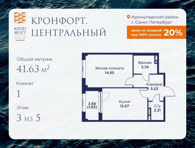 Стоимость квартиры указана со скидкой 20%. Скидка предоставляется при 100% оплате или несубсидированной ипотеке. Предлагается квартира площадью 39.28 кв.м в жилом комплексе "Кронфорт. Центральный" в Санкт-Петербурге (Кронштадт). Возможна покупка с использованием льготных и специальных ипотечных программ с государственной поддержкой. Высота потолков в квартирах — от 3 до 3,4 метров, окна увеличенного размера, есть варианты с эркерами, французскими балконами, лоджиями и террасами. Жилой квартал состоит из пяти четырехэтажных корпусов с закрытыми охраняемыми дворами, свободными от машин. Первые этажи формируют торговые променады в стиле пешеходных улиц исторической части Петербурга и Кронштадта. Внутренние пространства между корпусами — пешеходные зоны с уютными площадями. Архитектурный облик квартала разработан бюро "Проектная культура" и международной компанией Chapman Taylor. Инфраструктура комплекса включает: - Лицей с двумя бассейнами - Детский сад на 150 мест с бассейном и закрытой территорией - Веревочный парк - Игровые площадки для активного отдыха; - Кабинет врача общей практики. - Подземные паркинги с лифтами. - Мусоросборные камеры, индивидуальные кладовые. - Закрытые дворы с контролем доступа и видеонаблюдением. - Мультформатный стрит-ретейл с кафе и ресторанами. - Триатлон-центр и беговые/велодорожки. - Учебно-тренировочный комплекс для детей "Лагерь настоящих героев". Транспортная доступность обеспечивает удобный выезд на КАД (около 1-3 км), 2 минуты пешком до автобусной остановки "Лицей", 25 минут до Сестрорецка, 30 минут до "Лахта-центра", 50 минут до аэропорта "Пулково" и 60 минут до Московского вокзала. Для любителей моря доступен маршрут на "Метеоре" до центра Санкт-Петербурга. Отделка квартир предлагается как с готовой чистовой отделкой, так и со свободной планировкой без отделки для реализации индивидуальных дизайнерских решений. В третьем корпусе, продажи которого стартовали в марте 2025 года, доступны квартиры с просторными террасами, тремя балконами, кухнями-гостиными до 38 кв.м с окнами на две стороны, обеспечивающими панорамное освещение и виды. Если вам нужна помощь с оформлением ипотеки или дополнительная информация по комплексу и условиям покупки, обращайтесь в отдел продаж за консультацией. Продам 1-комнатную квартиру 40 м2 (квадратных метров) в Кронштадте.