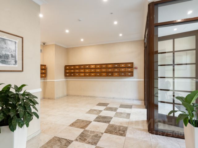 Несмотря на 4-й этаж 9-этажного дома, квартира очень светлая: окна выходят на юг и север, во внутренний двор-колодец который является самым большим и просторный в комплексе.