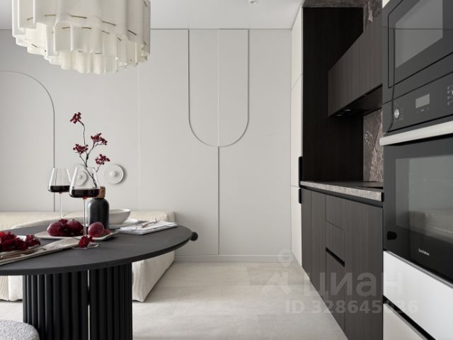 - на кухне: кухонный гарнитур со встроенной варочной панелью и духовым шкафом, холодильник, микроволновка, чайник, столовая группа, раскладной диван
