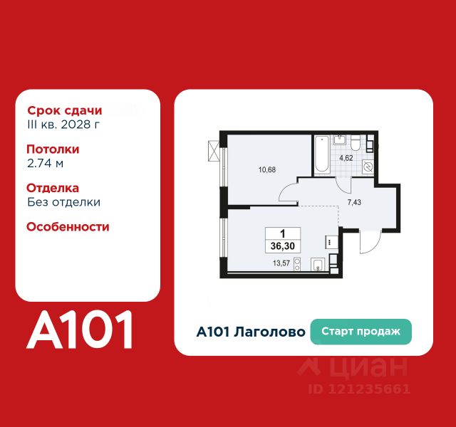 ПЕРЕУСТУПКА ПРАВА! Продаётся квартира в новостройке — ЖК "А101 Лаголово" , корп. 1.1 Общая площадь квартиры — 34,6 кв. м., этаж 3 из 9, секция 1 Без отделки Тип проекта, по которому построен дом — монолит Компания-застройщик — ГК "А101". Срок сдачи — 4-й квартал 2025 ОТДЕЛКА Квартира передается без отделки. Благодаря тому, что в данном типе отделки стены не возводятся, вы сможете создать удобную планировку и самостоятельно организовать зонирование комнат. ОСОБЕННОСТИ ПЛАНИРОВКИ Мезонин - полуэтаж с большим количеством естественного света. На втором уровне можно организовать спальню или кабинет. Патио - это собственный дворик или терраса с выходом из квартиры во двор, огорожен живой изгородью, пол надежно защищен бетонной плитой. ПАРАДНАЯ В каждой парадной предусмотрены места для хранения велосипедов и колясок, гостевой санузел, лапамойка (место для мытья домашних животных или колес велосипедов) и удобная зона ожидания для гостей. ДВОРЫ И ОКРУЖЕНИЕ Просторные дворы свободны от машин и закрыты от посторонних. Большую часть комплекса займут благоустроенные зелёные зоны, теневые сады и городские общественные пространства с развитой тротуарной сетью и велодорожками. Каждый дом оборудован системами видеонаблюдения и контроля доступа. "А101 Лаголово" - современный город у подножия знаменитых Дудерговских высот, в объятиях чистейших озёр и зелёных живописных массивов, наполненный всем необходимым для счастливой жизни. ИНФРАСТРУКТУРА. Мы занимаемся комплексным освоением территории. Наш приоритет - доступность всех сервисов для счастливой жизни. 1. Лаголово-город 15-ти минутной доступности. Вся необходимая инфраструктура: магазины, салоны красоты, образовательные учреждения, медицинские центры находятся в 15-ти минутах пешей прогулки от любой точки жилого комплекса. Это позволяет не тратить время на долгие перемещения. 2. Представьте идеальный город, где ребенок может спокойно играть, а пожилой человек наслаждаться заслуженным отдыхом. Жилая среда нашего комплекса может комфортно использоваться как 8-летним ребенком, так и 80-летним пожилым человеком. Дома, улицы, общественные пространства, тротуары спроектированы с заботой о людях разных возрастов. 3. Мы активно развиваем авторскую образовательную экосистему "Лёрнити". Она включает строительство 8 современных детских садов (2000 мест) и 3 школ (2945 учащихся). Мы учим родителей гармонично общаться с детьми, помогаем малышам подготовиться к школе, а подросткам - выбрать будущую профессию и развить таланты.