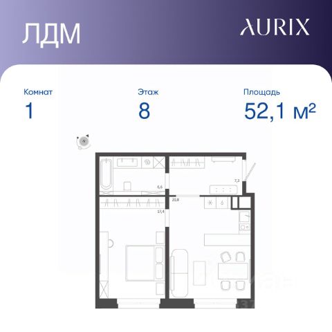 Продается 1-к квартира без отделки в ЖК "ЛДМ". Общая площадь квартиры — 52.1 кв. м, этаж 8 из 8. Тип дома — монолитный. Цена указана при 100% оплате. Описание из материнского фида
