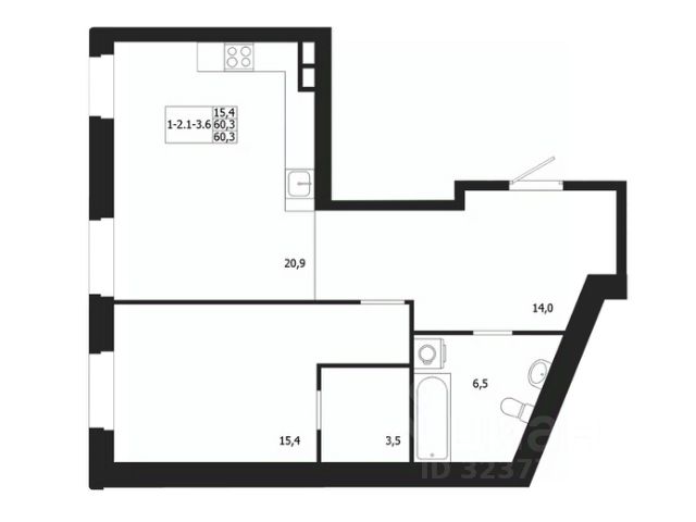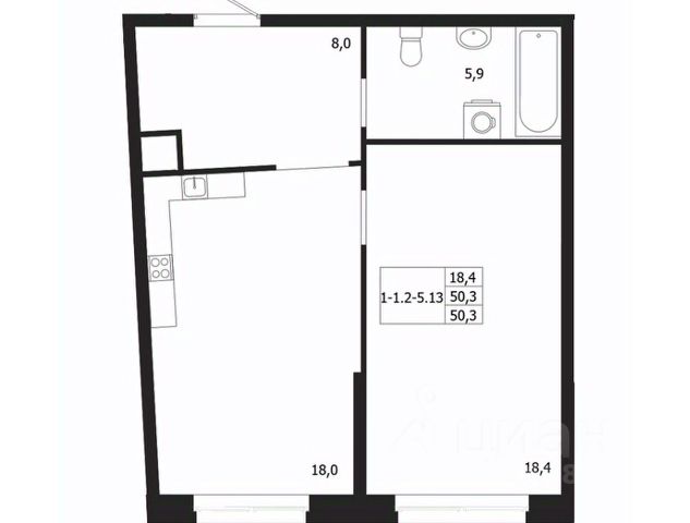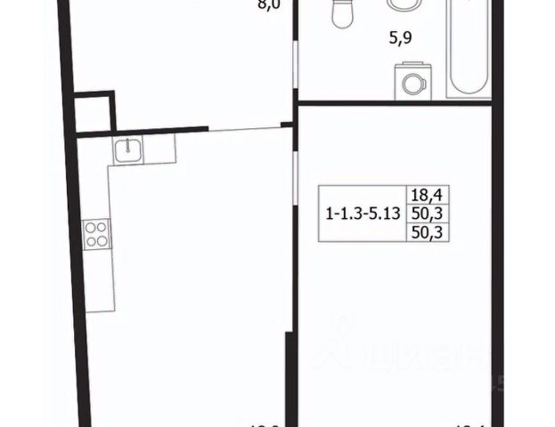 Жилая площадь 64.59 м2, кухня 12.11 м2, черновая отделка.