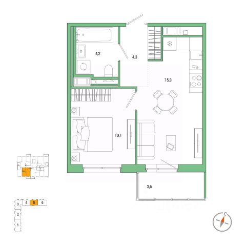 Продаётся 1-комнатная квартира в строящемся доме (Дом 6.3.1), срок сдачи: II-кв. 2028, общей площадью 36.96 кв.м., на 5 этаже.