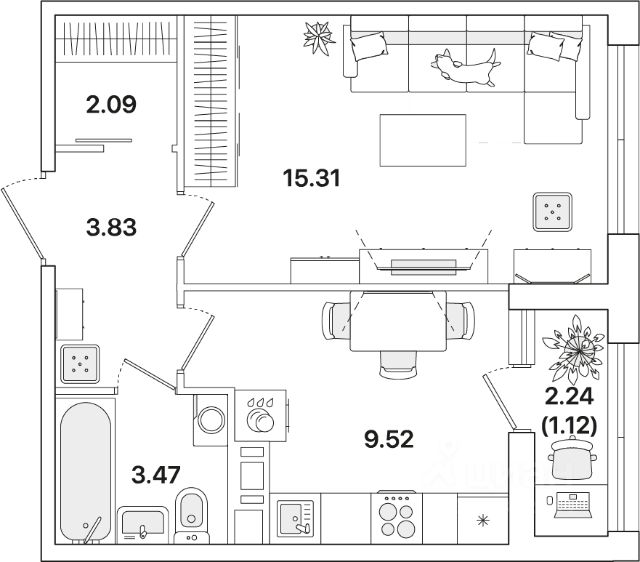 Квартира находится на 9 этаже корпуса 1.1. Общая площадь квартиры 31,25 кв.м.