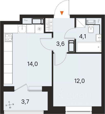 Совмещенный санузел (3,7м), что увеличивает полезное пространство.