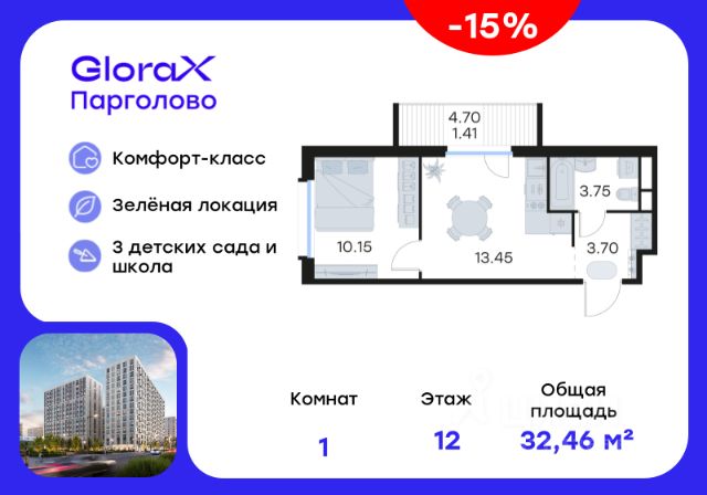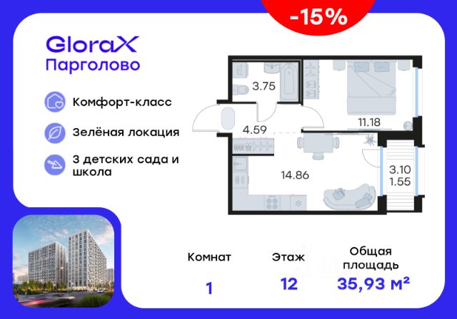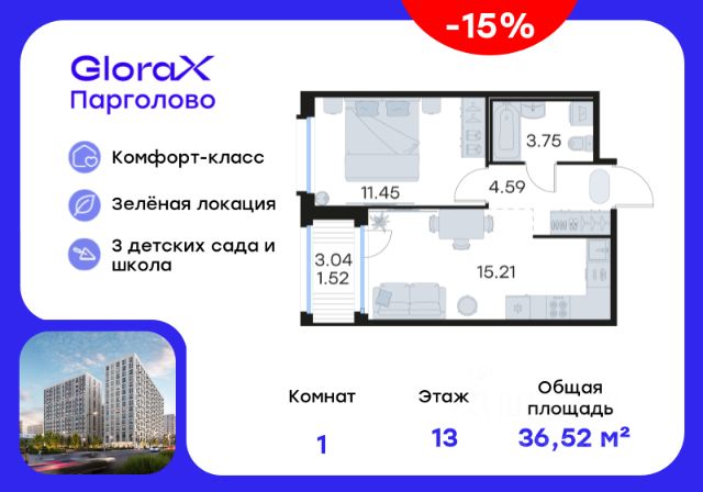 Продается 1-комн. квартира на 5-м этаже в проекте комфорт-класса GloraX Парголово. Общая площадь лота составляет 37,53 кв. м, из которых 14,28 кв. м отведено под жилую и 11,06 кв. м под кухонную зону. Номер квартиры - 46. Преимущества: - Квартира комфорт-класса - Зеленый район, Шуваловский парк в 20 мин. пешком - 10 мин. до КАД, 15 мин. до ЗСД - 5 эт. паркинг на 451 м/м - Закрытые дворы с видеонаблюдением - Детские площадки с геопласткой и бизиборадми - Сады и школы в шаговой доступности - Спортивные площадки и велодорожки - Собственный комьюнити-центр - Келлеры для хранения - Коммерческие помещения на 1 этажах GloraX Парголово — масштабный проект комфорт-класса в Выборгском районе Санкт-Петербурга. Место, продуманное до мелочей, где все, что необходимо — рядом. Архитектурно-пространственное решение отличается лаконичностью и строгостью и придает проекту свой характер. Внутренние дворы закрыты от внешнего мира, создавая приватную территорию для жителей. Живите на природе, но с комфортом мегаполиса. Десять минут на велосипеде или полчаса пешком — и вы окажетесь в одном из культовых мест отдыха петербуржцев: Шуваловском парке, Орловском заказнике с их чистыми карьерами или на Суздальских озерах. До ж/д станции "Парголово" 7 минут на автомобиле, до метро Проспект Просвещения 25 минут, КАД 10 минут, ЗСД 15 минут. В шаговой доступности остановка общественного транспорта. В шаговой доступности — собственные школы и детские сады. Здесь все создано для максимального комфорта каждого жителя. Приватное пространство внутреннего двора с беседками с розетками для работы и отдыха, зеленый двор с уютным многоуровневым освещением, детскими эко-площадками и спортивными workout создает неповторимую атмосферу, заряжающую энергией на новые свершения. Квартиры сдаются без отделки. Цена указана при 100% оплате или стандартной ипотеке. Узнайте подробности в Отделе продаж.