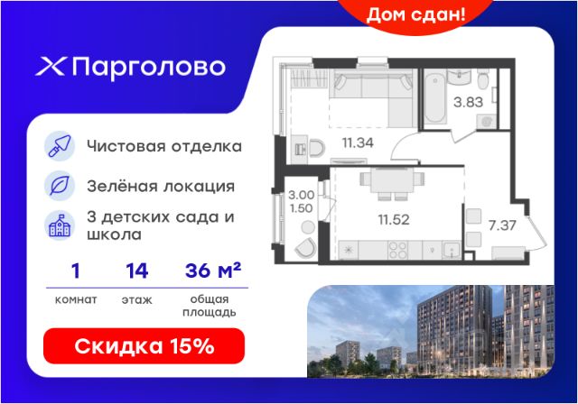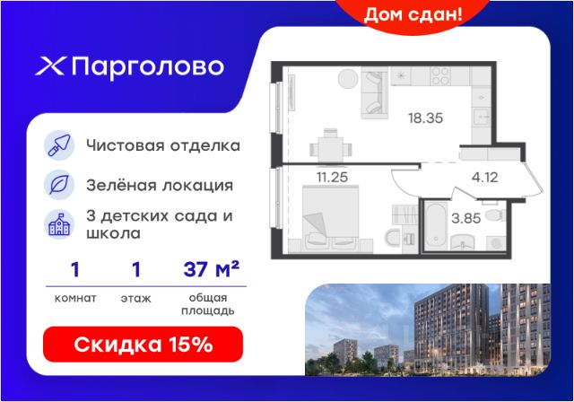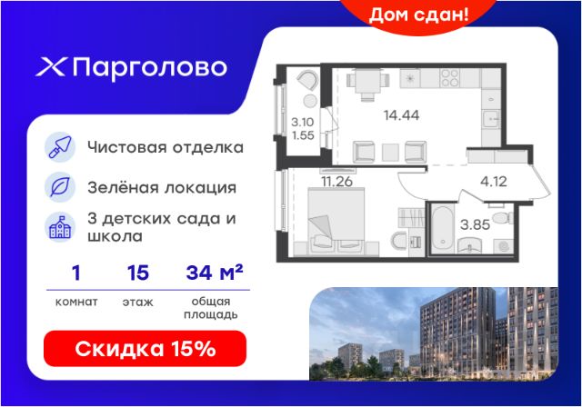 Продается 1-комн. квартира на 13-м этаже в проекте комфорт-класса Парголово. Общая площадь лота составляет 32,93 кв. м, из которых 10,15 кв. м отведено под жилую и 13,98 кв. м под кухонную зону. Номер квартиры - 124. Преимущества: - Квартира комфорт-класса - Зеленый район, Шуваловский парк в 20 мин. пешком - 10 мин. до КАД, 15 мин. до ЗСД - 5 эт. паркинг на 451 м/м - Закрытые дворы с видеонаблюдением - Детские площадки с геопласткой и бизиборадми - Сады и школы в шаговой доступности - Спортивные площадки и велодорожки - Собственный комьюнити-центр - Келлеры для хранения - Коммерческие помещения на 1 этажах Парголово — масштабный проект комфорт-класса в Выборгском районе Санкт-Петербурга девелопера GloraX. Место, продуманное до мелочей, где все, что необходимо — рядом. Архитектурно-пространственное решение отличается лаконичностью и строгостью и придает проекту свой характер. Внутренние дворы закрыты от внешнего мира, создавая приватную территорию для жителей. Живите на природе, но с комфортом мегаполиса. Десять минут на велосипеде или полчаса пешком — и вы окажетесь в одном из культовых мест отдыха петербуржцев: Шуваловском парке, Орловском заказнике с их чистыми карьерами или на Суздальских озерах. До ж/д станции "Парголово" 7 минут на автомобиле, до метро Проспект Просвещения 25 минут, КАД 10 минут, ЗСД 15 минут. В шаговой доступности остановка общественного транспорта. В шаговой доступности — собственные школы и детские сады. Здесь все создано для максимального комфорта каждого жителя. Приватное пространство внутреннего двора с беседками с розетками для работы и отдыха, зеленый двор с уютным многоуровневым освещением, детскими эко-площадками и спортивными площадками создает неповторимую атмосферу, заряжающую энергией на новые свершения. Квартиры сдаются без отделки. Узнайте подробности в Отделе продаж.