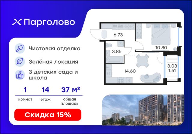 Продается 1-комн. квартира на 2-м этаже в проекте комфорт-класса GloraX Парголово. Общая площадь лота составляет 37,53 кв. м, из которых 14,28 кв. м отведено под жилую и 11,06 кв. м под кухонную зону. Номер квартиры - 16. Преимущества: - Квартира комфорт-класса с полной чистовой отделкой - Зеленый район, Шуваловский парк в 20 мин. пешком - 10 мин. до КАД, 15 мин. до ЗСД - 5 эт. паркинг на 451 м/м - Закрытые дворы с видеонаблюдением - Детские площадки с геопласткой и бизиборадми - Сады и школы в шаговой доступности - Спортивные площадки и велодорожки - Собственный комьюнити-центр - Келлеры для хранения - Коммерческие помещения на 1 этажах GloraX Парголово — масштабный проект комфорт-класса в Выборгском районе Санкт-Петербурга. Место, продуманное до мелочей, где все, что необходимо — рядом. Архитектурно-пространственное решение отличается лаконичностью и строгостью и придает проекту свой характер. Единая галерея объединяет пять 15-этажных секций и отделяет внутренний двор от внешнего мира, создавая приватную территорию для жителей. Живите на природе, но с комфортом мегаполиса. Десять минут на велосипеде или полчаса пешком — и вы окажетесь в одном из культовых мест отдыха петербуржцев: Шуваловском парке, Орловском заказнике с их чистыми карьерами или на Суздальских озерах. До ж/д станции "Парголово" 7 минут на автомобиле, до метро Проспект Просвещения 25 минут, КАД 10 минут, ЗСД 15 минут. В шаговой доступности остановка общественного транспорта. В шаговой доступности — собственные школы и детские сады. Здесь все создано для максимального комфорта каждого жителя. Приватное пространство внутреннего двора с беседками с розетками для работы и отдыха, зеленый двор с уютным многоуровневым освещением, детскими эко-площадками и спортивными workout создает неповторимую атмосферу, заряжающую энергией на новые свершения. Получить ключи и сразу переехать? Легко! Мы подготовили для вас отделку в двух цветовых гаммах: светлую Actual и контрастную — Art. Узнайте подробности в Отделе продаж.