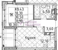 Идеальная планировка: спальня 10,3 м², кухня-гостиная 12 м², коридор 3,6 м², санузел 4,4 м² — все помещения правильной формы, без лишних потерь на площади.