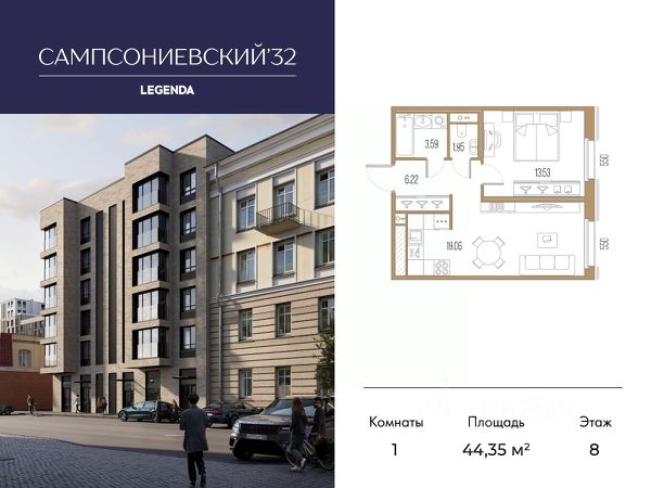 Квартира с одной спальней в комплексе "Сампсониевский 32" от LEGENDA на 2 этаже. -Общая площадь: 54.78 кв.м. -Жилая: 10.97 кв.м. -Площадь просторной кухни-столовой: 21.77 кв.м. -Высота потолков 2.7 м. Все окна выходят на одну сторону. В квартире один раздельный санузел. ЖК "Сампсониевский, 32" квартал бизнес-класса в Выборгском районе Санкт-Петербурга недалеко от набережной Большой Невки и Петроградской стороны. Отличают комплекс каскадные фасады с большой площадью остекления, видовые квартиры с террасами. Современные инженерные и технические решения, повышающие качество жизни TechnoBox включают в себя: стационарный и удаленный контроль дома, систему Air Design, обеспечивающую чистый воздух без лишнего шума, мультисервисную сеть, объединяющую коммуникационные системы. Квартиры сдаются с предчистовой отделкой: выровнены пол и стены, проведена электрика, предусмотрена шумоизоляция, встроенная система вентиляции. В каждой квартире установлена взломостойкая входная дверь, окна со специальным термоизолированным алюминиевым профилем. В ЖК "Сампсониевский, 32" много вариантов планировок: квартиры с террасой, мастер-спальней, ванной комнатой с окном, гардеробной комнатой. Двор закрыт от транспорта, здесь будут зоны с дизайнерским оформлением для игр и отдыха. Срок сдачи 4 квартал 2026 года. В отапливаемом подземном паркинге 298 мест, спуститься туда можно на лифте из своей квартиры. Комплекс находится на границе крупных районов, рядом с набережными, которые ведут в Приморский, Калининский и Центральный районы, а через Сампсониевский, Гренадёрский и Кантемировский мосты можно попасть в Петроградский район. До станции метро "Выборгская" 900 м, до станции метро "Петроградская" 2,6 км. Финляндский вокзал находится в 2,5 км от ЖК, а Западный скоростной диаметр (ЗСД) в 10 км. Рядом с ЖК находится несколько гимназий, общеобразовательных школ и детских садов. Здесь много медицинских учреждений, кафе, ресторанов, торговых центров, гипермаркетов. Меньше чем в 1 км от ЖК Сампсониевский и Выборгский сады, а в 2 км находится Ботанический сад, набережная реки Карповки с качелями и зонами отдыха у воды. Квартира реализуется напрямую от застройщика. Обращение по данному предложению осуществляется через отдел продаж застройщика. Для агентств недвижимости действует отдельный формат сотрудничества.