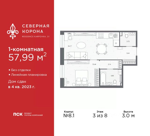 1-комн. квартира в ЖК "Северная корона" на 8 этаже. Квартира без отделки, новый собственник может сделать ремонт по своему проекту. Общая площадь: 43 кв.м., жилая: 12.48 кв.м., площадь просторной кухни-столовой: 14.91 кв.м. Все окна выходят на одну сторону. В квартире один совмещенный и один раздельный санузел. Высота потолков 3.0 м. Квартира находится в корпусе 5. Дом монолитный, одноподъездный, высотой 8 этажей. На этаже 4 квартиры. В подъезде 1 грузовой лифт. В настоящее время строительство окончено, дом сдан в 4 квартале 2023 года. Оформление сделки по договору купли-продажи. В шаговой доступности от жилого комплекса имеются станции метро (расстояние по прямой): "Петроградская" (500 м), "Чкаловская" (1.3 км), "Горьковская" (1.7 км), "Чёрная речка" (1.7 км), также недалеко от этого корпуса находятся станции метро: "Чернышевская", "Спортивная". Премиальный жилой комплекс "Северная корона" расположился в парадной части Петроградской стороны на пересечении ее главного проспекта — Каменноостровского и набережной реки Карповки. Двухсотметровое парадное лобби, дизайнерский ландшафт, собственная фитнес-студия, парадная гостиная для встреч и переговоров, игровой клуб для детей. А также: системы очистки и подготовки воды и воздуха, консьерж-сервис, бесключевой доступ, помещения для ожидания и многое другое. Архитектура премиального дома "Северная корона" — это современное воплощение и новое развитие архитектуры северного модерна. Особенность и уникальность дома в его протяженности вдоль реки Карповки. Фасад исключает монотонность, линии интегрированы в канву курдонера и внутренних общественных пространств, обращённых как в сторону Каменноостровского проспекта, так и Иоановского монастыря. Все квартиры в полной мере можно назвать видовыми они открыты историческому окружению и ландшафтной архитектуре. Что дарит владельцам единственные в своем роде захватывающие виды. Этажность: 4 - 9 этажей (в т.ч. 1 подземный) Дом СДАН. Класс проекта: Премиум класс Уникальность проекта: - Французские балконы - Видовые квартиры - Панорамное остекление - Потолки до 3,5 метров - Мансардные окна - Индивидуальные сплит шахты - Считывание номеров автомобилей - Современная архитектура и инженерия - Двор парк - Центральное лобби 200 кв.м. #ZuAW4C Продам 1-комнатную квартиру элитные на набережной Реки Карповки в Санкт-Петербурге.