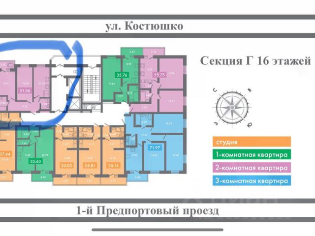 Общ. площадь 42.5 м², с балконом 47.4 м²