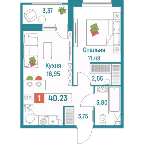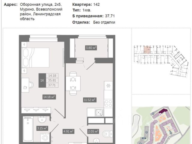 Квартира площадью 37,71 м², с комнатой 14,18 м² и просторной кухней 11,52 м². Санузел раздельный, есть лоджия. Расположена на первом этаже - удобно для семьи с детьми, пожилых людей или просто тех, кто не любит ждать лифт. Из окон открывается приятный вид на парк, рядом нет шумных дорог в квартире будет тихо и спокойно.