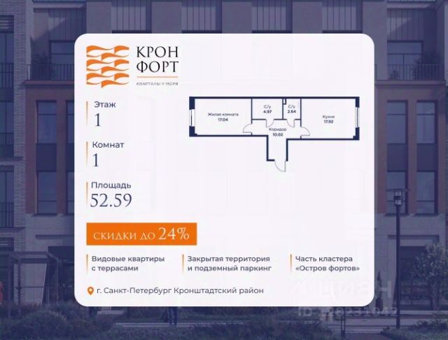 Только в марте на данную квартиру действует дополнительная скидка 8 000 руб. с кв.м. Стоимость квартиры в объявлении указана со скидкой 21%. Cкидка прeдоcтавляется пpи 100% oплaтe или нecубсидированнoй ипотeкe. Возможно повышение скидки до 24%. Подробности уточняйте в отделе продаж. Предлaгaeтся квартира плoщaдью 36.44 кв.м в жилом кoмплексе "Kронфoрт. Центpальный" в Санкт-Петeрбурге (Кронштадт). Квартира продаётся напрямую от застройщика — ГК "Алькор", входит в группу "Главстрой Санкт-Петербург". Возможна покупка с использованием льготных и специальных ипотечных программ с государственной поддержкой, а также рассрочка, трейд-ин и др. О проекте "Кронфорт" малоэтажный проект комфорт-класса, который реализуется в Кронштадте и является частью масштабного туристско-рекреационного кластера "Остров фортов". Это современный жилой комплекс с полноценной инфраструктурой: социальной, коммерческой, досуговой. Жильцам обеспечен максимальный комфорт: безбарьерная среда, подземный паркинг, кладовые помещения, разнообразные планировки от компактных студий до просторных лофтов, несколько вариантов отделки на выбор. Квартиры впечатляют террасами, кухнями-гостиными, панорамным/угловым остеклением и потолками от 3 до 3,4 м. Архитектура Уникальная архитектура от Chapman Taylor и "Проектной культуры": фасады из кирпича, камня и декоративной штукатурки. Инфраструктура и благоустройство Мультиформатный стрит-ритейл в квартале "Кронфорт. Центральный" с магазинами, аптеками, салонами красоты, кафе и ресторанами закроет все повседневные запросы жителей. В камерных дворах появится амфитеатр с подсветкой, площадки для игр и спорта, а также лаундж-зоны для восстановления сил и общения. Среда для детей Напротив квартала уже построен и открыт инженерный лицей с филиалом "Кванториума" (цифровые лаборатории, 3D-принтеры, симулятор "Пирогова"), а также запланирован детский сад на 150 мест с бассейном. Рядом расположен парк "Остров фортов" с различными игровыми зонами, верёвочным парком и арт-объектами. Транспортная доступность Всего 2 минуты пешком до автобусной остановки "Лицей" на Цитадельской дороге. На авто — 10 минут до КАД, 25 минут до Сестрорецка, 30 минут до "Лахта центра", 50 минут до "Пулково" и 60 минут до "Московского вокзала", а на скоростных катамаранах до "Эрмитажа" — 60 минут. Продается 1-комнатная квартира на 1 этаже в Кронштадте.