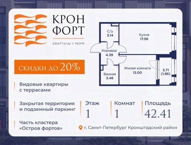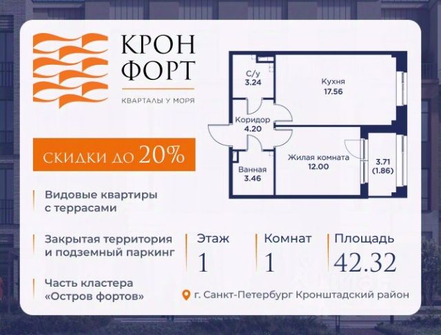 Стоимость квартиры указана со скидкой 20%. Скидка предоставляется при 100% оплате или несубсидированной ипотеке. Предлагается квартира площадью 52.3 кв.м в жилом комплексе "Кронфорт. Центральный" в Санкт-Петербурге (Кронштадт). Возможна покупка с использованием льготных и специальных ипотечных программ с государственной поддержкой. Высота потолков в квартирах — от 3 до 3,4 метров, окна увеличенного размера, есть варианты с эркерами, французскими балконами, лоджиями и террасами. Жилой квартал состоит из пяти четырехэтажных корпусов с закрытыми охраняемыми дворами, свободными от машин. Первые этажи формируют торговые променады в стиле пешеходных улиц исторической части Петербурга и Кронштадта. Внутренние пространства между корпусами — пешеходные зоны с уютными площадями. Архитектурный облик квартала разработан бюро "Проектная культура" и международной компанией Chapman Taylor. Инфраструктура комплекса включает: - Лицей с двумя бассейнами - Детский сад на 150 мест с бассейном и закрытой территорией - Веревочный парк - Игровые площадки для активного отдыха; - Кабинет врача общей практики. - Подземные паркинги с лифтами. - Мусоросборные камеры, индивидуальные кладовые. - Закрытые дворы с контролем доступа и видеонаблюдением. - Мультформатный стрит-ретейл с кафе и ресторанами. - Триатлон-центр и беговые/велодорожки. - Учебно-тренировочный комплекс для детей "Лагерь настоящих героев". Транспортная доступность обеспечивает удобный выезд на КАД (около 1-3 км), 2 минуты пешком до автобусной остановки "Лицей", 25 минут до Сестрорецка, 30 минут до "Лахта-центра", 50 минут до аэропорта "Пулково" и 60 минут до Московского вокзала. Для любителей моря доступен маршрут на "Метеоре" до центра Санкт-Петербурга. Отделка квартир предлагается как с готовой чистовой отделкой, так и со свободной планировкой без отделки для реализации индивидуальных дизайнерских решений. В третьем корпусе, продажи которого стартовали в марте 2025 года, доступны квартиры с просторными террасами, тремя балконами, кухнями-гостиными до 38 кв.м с окнами на две стороны, обеспечивающими панорамное освещение и виды. Если вам нужна помощь с оформлением ипотеки или дополнительная информация по комплексу и условиям покупки, обращайтесь в отдел продаж за консультацией.