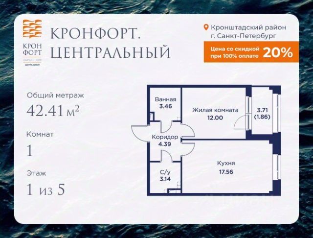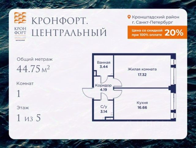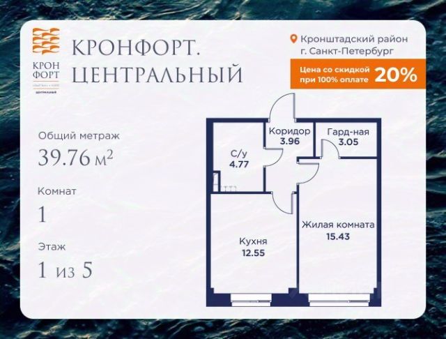 Стоимость квартиры указана со скидкой 20%. Скидка предоставляется при 100% оплате или несубсидированной ипотеке. Предлагается квартира площадью 52.3 кв.м в жилом комплексе "Кронфорт. Центральный" в Санкт-Петербурге (Кронштадт). Возможна покупка с использованием льготных и специальных ипотечных программ с государственной поддержкой. Высота потолков в квартирах — от 3 до 3,4 метров, окна увеличенного размера, есть варианты с эркерами, французскими балконами, лоджиями и террасами. Жилой квартал состоит из пяти четырехэтажных корпусов с закрытыми охраняемыми дворами, свободными от машин. Первые этажи формируют торговые променады в стиле пешеходных улиц исторической части Петербурга и Кронштадта. Внутренние пространства между корпусами — пешеходные зоны с уютными площадями. Архитектурный облик квартала разработан бюро "Проектная культура" и международной компанией Chapman Taylor. Инфраструктура комплекса включает: - Лицей с двумя бассейнами - Детский сад на 150 мест с бассейном и закрытой территорией - Веревочный парк - Игровые площадки для активного отдыха; - Кабинет врача общей практики. - Подземные паркинги с лифтами. - Мусоросборные камеры, индивидуальные кладовые. - Закрытые дворы с контролем доступа и видеонаблюдением. - Мультформатный стрит-ретейл с кафе и ресторанами. - Триатлон-центр и беговые/велодорожки. - Учебно-тренировочный комплекс для детей "Лагерь настоящих героев". Транспортная доступность обеспечивает удобный выезд на КАД (около 1-3 км), 2 минуты пешком до автобусной остановки "Лицей", 25 минут до Сестрорецка, 30 минут до "Лахта-центра", 50 минут до аэропорта "Пулково" и 60 минут до Московского вокзала. Для любителей моря доступен маршрут на "Метеоре" до центра Санкт-Петербурга. Отделка квартир предлагается как с готовой чистовой отделкой, так и со свободной планировкой без отделки для реализации индивидуальных дизайнерских решений. В третьем корпусе, продажи которого стартовали в марте 2025 года, доступны квартиры с просторными террасами, тремя балконами, кухнями-гостиными до 38 кв.м с окнами на две стороны, обеспечивающими панорамное освещение и виды. Если вам нужна помощь с оформлением ипотеки или дополнительная информация по комплексу и условиям покупки, обращайтесь в отдел продаж за консультацией.