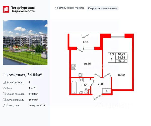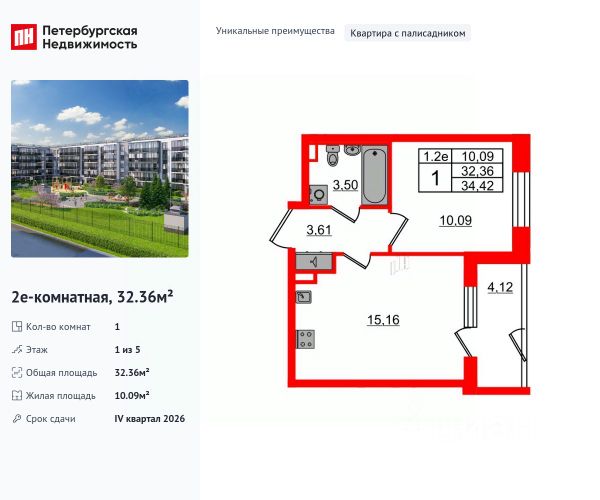 Продается уютная 1-комнатная квартира от застройщика в жилом комплексе "Парадный ансамбль" в престижном Московском районе. До метро можно добраться на транспорте всего за 20 минут. Уникальная, функциональная европланировка, большая кухня-гостиная 15.16 м², вместительная прихожая 3.61 м². Общая площадь квартиры - 32.36 м², жилая 10.09 м², высота потолка 2.77 м. Квартира продается с отделкой "Норд Лайн светлый". Что особенного в ЖК "Парадный ансамбль"? • Уникальные квартиры. Хай Флет (High Flat) на последних этажах, палисадники у квартир на первом этаже, семейные секции, квартиры с саунами и окном в ванной • Масштабное малоэтажное строительство в престижном Московском районе • Рекреационные зоны: парадный парк в центре квартала, ручей с собственной набережной, центральная площадь, ресторанный комплекс и пешеходный бульвар • Фасады из керамогранита и кирпича с яркими и акцентными входными группами • Две самые большие площадки Setl Kids и Setl Sport • Инновационный Лицей Setl с оригинальной архитектурной концепцией и уникальной образовательной средой