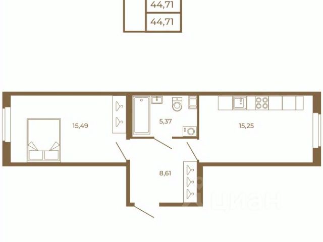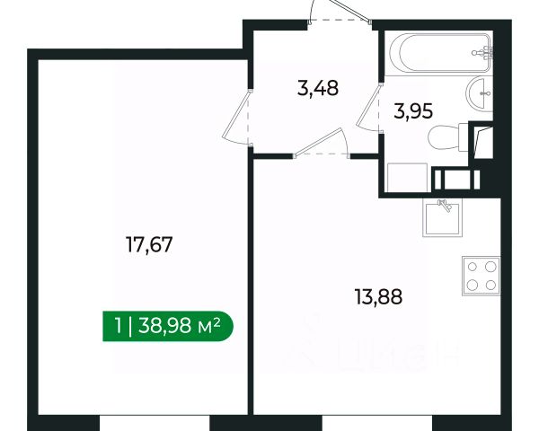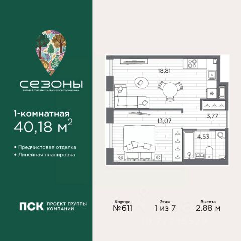 Продается 1-комнатная квартира 43,66 кв.м. на 1 этаже. В продаже квартира в жилом комплексе комфорт-класса "Финский квартал".