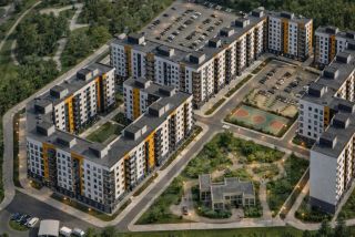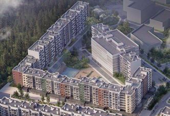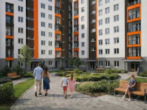 В состав жилого комплекса "Ювента" входит три здания комфорт-класса высотой 6, 9 и 11 этажей с яркими разноцветными фасадами, а также пристроенный корпус детского сада на 80 малышей.