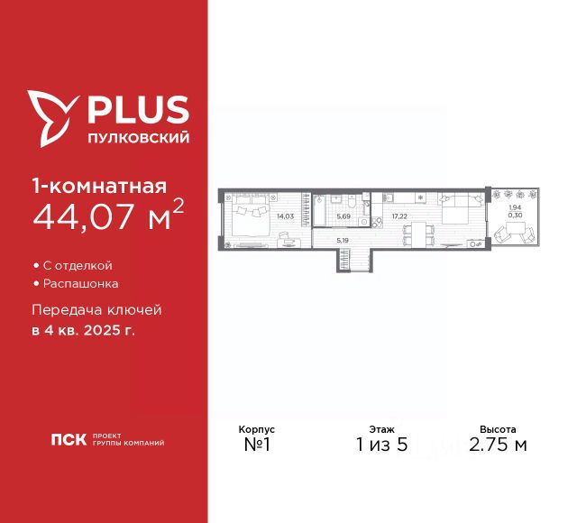 Просторная однокомнатная квартира с отделкой в ЖК "PLUS Пулковский" на 1 этаже. Общая площадь: 44.07 кв.м., жилая: 14.03 кв.м., площадь просторной кухни-столовой: 17.22 кв.м. Квартира - распашонка, без проходных комнат, окна выходят на paзные стороны дома. В квартире один совмещенный санузел. Терраса представляет собой роскошную зону отдыха, где вы на свой вкус можете создать атмосферу комфорта и уюта. Высота потолков 2.75 м.