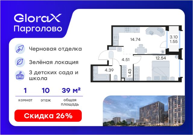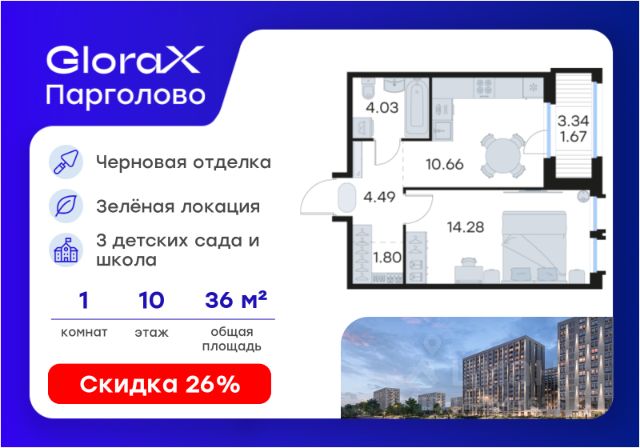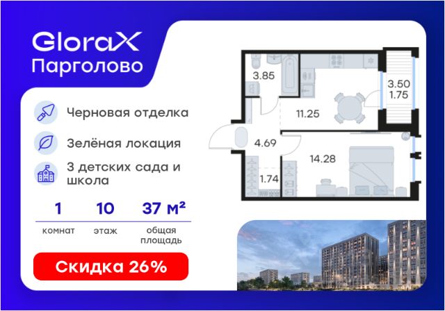 Продается 1-комн. квартира на 10-м этаже в проекте комфорт-класса GloraX Парголово. Общая площадь лота составляет 37,53 кв. м, из которых 10,82 кв. м отведено под жилую и 14,62 кв. м под кухонную зону. Номер квартиры - 225. Преимущества: - Квартира комфорт-класса - Зеленый район, Шуваловский парк в 20 мин. пешком - 10 мин. до КАД, 15 мин. до ЗСД - 5 эт. паркинг на 451 м/м - Закрытые дворы с видеонаблюдением - Детские площадки с геопласткой и бизиборадми - Сады и школы в шаговой доступности - Спортивные площадки и велодорожки - Собственный комьюнити-центр - Келлеры для хранения - Коммерческие помещения на 1 этажах GloraX Парголово — масштабный проект комфорт-класса в Выборгском районе Санкт-Петербурга. Место, продуманное до мелочей, где все, что необходимо — рядом. Архитектурно-пространственное решение отличается лаконичностью и строгостью и придает проекту свой характер. Внутренние дворы закрыты от внешнего мира, создавая приватную территорию для жителей. Живите на природе, но с комфортом мегаполиса. Десять минут на велосипеде или полчаса пешком — и вы окажетесь в одном из культовых мест отдыха петербуржцев: Шуваловском парке, Орловском заказнике с их чистыми карьерами или на Суздальских озерах. До ж/д станции "Парголово" 7 минут на автомобиле, до метро Проспект Просвещения 25 минут, КАД 10 минут, ЗСД 15 минут. В шаговой доступности остановка общественного транспорта. В шаговой доступности — собственные школы и детские сады. Здесь все создано для максимального комфорта каждого жителя. Приватное пространство внутреннего двора с беседками с розетками для работы и отдыха, зеленый двор с уютным многоуровневым освещением, детскими эко-площадками и спортивными workout создает неповторимую атмосферу, заряжающую энергией на новые свершения. Квартиры сдаются без отделки. Цена указана при 100% оплате или стандартной ипотеке. Узнайте подробности в Отделе продаж.
