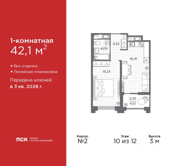 Просторная однокомнатная квартира в Клубный квартал "Ассамблея" на 10 этаже. Квартира без отделки, полностью готова к ремонту. Общая площадь: 42.1 кв.м., жилая: 15.23 кв.м., площадь просторной кухни-столовой: 16.41 кв.м. Все окна выходят на одну сторону. В квартире одна лоджия, один совмещенный санузел. Высота потолков 3 м. Дом монолитный, двухподъездный, высотой 12 этажей. Квартира находится во 2-й секции в корпусе 2. На этаже 4 квартиры. В подъезде 1 пассажирский и 1 грузовой лифт. Начало строительства - 2 квартал 2025 года. Окончание строительства - 3 квартал 2028 года. Оформление сделки по договору долевого участия. В шаговой доступности от жилого комплекса находятся станции метро (расстояние по прямой): "Горный институт" (1.0 км), "Василеостровская" (1.4 км), "Приморская" (1.5 км), также недалеко от этого корпуса находятся станции метро: "Спортивная", "Чкаловская". "Клубный квартал Ассамблея" — проект бизнес-класса на Васильевском острове, в самом сердце исторического Петербурга. Комплекс состоит из пяти корпусов переменной этажности — от 7 до 12 этажей — с выразительной архитектурой в стиле неомодернизма: светлый клинкер, панорамное остекление, просторное лобби с потолками высотой почти 8 метров. Потолки — до 3,2 метров. Подземный паркинг на 667 машиномест. Комфорт и инфраструктура Проект ориентирован на комфортную городскую жизнь. В закрытом дворе — ландшафтное озеленение, современные детские и спортивные площадки. Внутренний клуб для резидентов включает коворкинг, переговорные, кинозал, фитнес и бьюти-зону. IP-домофония с просмотром камер видеонаблюдения, дистанционное открывание дверей и доступа на территорию и в парадную со смартфона и планшета, просмотр показаний счетчиков, приложение для жителей PSK Home. Локация Расположение на Васильевском острове — сильная сторона проекта. До четырех станций метро ("Горный институт", "Василеостровская", "Спортивная", "Приморская") — 515 минут пешком. В шаговой доступности — зелёные зоны, культурные учреждения, в том числе сад "Василеостровец" и ДК имени Кирова. Основные магистрали Большой, Средний и Малый проспекты, Наличная и Уральская улицы. Съезд на ЗСД расположен недалеко от станции метро "Приморская", близ береговой линии. Благовещенский и Дворцовый мосты соединяют остров с центром города, а мосты Тучков, Биржевой и Бетанкура — с Петроградской стороной. Застройщик Группа компаний ПСК является одной из ведущих девелоперских компаний Санкт Петербурга. На протяжении 18 лет она возводит в Северной столице качественное жилье премиум, бизнес и комфорт-класса, социальные объекты школы и детские сады, апарт-отели и торговые центры. Является шестикратным обладателем золотого знака "Надежный застройщик России". #25FSuE