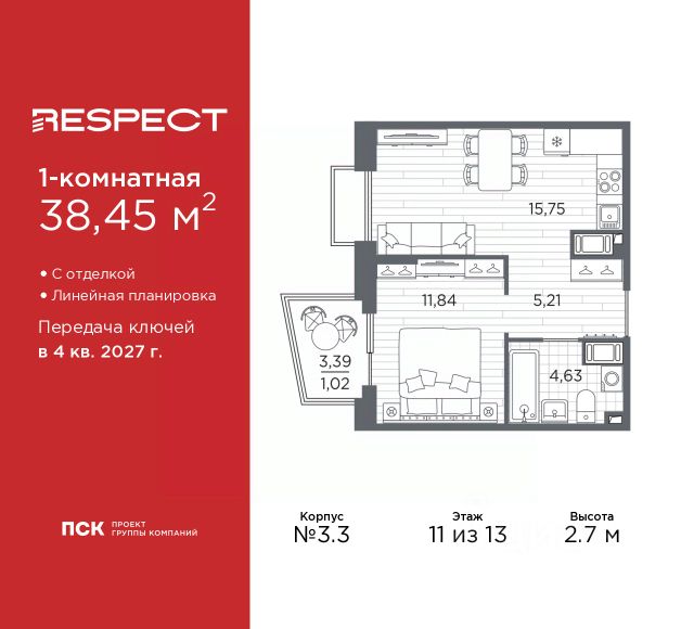 1-комн. квартира от застройщика с предчистовой отделкой в ЖК "RESPECT" на 11 этаже. Общая площадь: 37.17 кв.м., жилая: 14.51 кв.м., площадь просторной кухни-столовой: 11.04 кв.м. Все окна выходят на одну сторону. В квартире одна лоджия, один совмещенный санузел. Высота потолков 2.7 м. Квартира находится в корпусе 6. Дом монолитный, одноподъездный, высотой 13 этажей. На этаже 8 квартир. В подъезде 1 пассажирский и 1 грузовой лифт. Окончание строительства - 4 квартал 2026 года. Оформление сделки по договору долевого участия. В шаговой доступности от жилого комплекса имеются станции метро (расстояние по прямой): "Лесная" (800 м), "Площадь Мужества" (1.4 км), "Выборгская" (1.9 км), также недалеко от этого корпуса находятся станции метро: "Академическая", "Политехническая". Жилой квартал "RESPECT" строится на Полюстровском пр, 87, в одной из самых востребованных локаций Петербурга. В 10 минутах пешком - метро "Лесная" и в 10 минутах на транспорте - Петроградская сторона. Высота домов от 7 до 13 этажей. Квартиры сдаются с отделкой white box и с чистовой отделкой. На территории Respect строится школа на 1125 учащихся и детский сад на 240 мест. Запроектированы собственная газовая котельная, закрытая территория, дворы без машин и подземные паркинги с лифтами. В проекте предусмотрены трапециевидные балконы или остекленные лоджии, которые, с одной стороны, исключают монотонность фасада, являясь декоративными элементами, с другой дополнительным функциональным пространством в квартирах. Цветовая гармония фасадов каждого дома раскрывает характер квартала. Коричневый цвет клинкерного кирпича со структурой водяных штрихов — цвет уюта и безопасности, сдержанности и надёжности. Вентилируемые фасады облицованы клинкерным кирпичом. Его высокая прочность позволяет давать 100 лет гарантии на этот материал. Водопоглощение клинкерного кирпича составляет менее 5%, за счет чего у него высокая теплопроводность и прочность. В квартале запроектированы внутренние закрытые территории дворов домов без доступа автомобилей и безбарьерная среда для велосипедистов и колясок. Предусмотрены IP-домофония с функцией дистанционного открывания калиток и парадных, а также дистанционный сбор показаний счетчиков и мобильное приложение для жителей. Для безопасности жителей квартала - круглосуточное видеонаблюдение и служба охраны. В каждой квартире предусмотрены внешние корзины для кондиционеров. Вся территория квартала будет связана единой концепцией благоустройства, разработанной ландшафтным бюро L.BURO. На эксплуатируемой кровле на уровне первого этажа в домах 1 и 4 будут обустроены общественные видовые террасы. Это станет не только привлекательным местом с красивым видом, но и удобным, многофункциональным пространством. Дизайн парадных зон и входных групп - сочетание лаконичности отделки и декоративных элементов с текстурами из натурального камня и дерева с приглушенной подсветкой теплым светом. Во входных группах расположены гостевые зоны с мягкой мебелью. Отдель