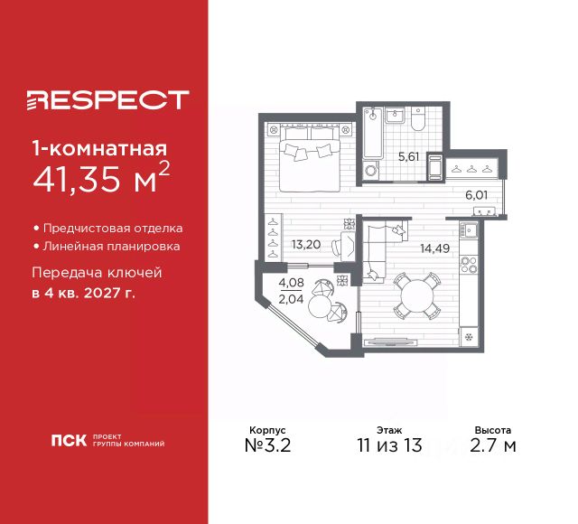 Просторная 1-комн. квартира с предчистовой отделкой в ЖК "RESPECT" на 11 этаже. Общая площадь: 37.17 кв.м., жилая: 14.51 кв.м., площадь просторной кухни-столовой: 11.04 кв.м. Все окна выходят на одну сторону. В квартире одна лоджия, один совмещенный санузел. Высота потолков 2.7 м. Квартира находится в корпусе 6. Дом монолитный, одноподъездный, высотой 13 этажей. На этаже 8 квартир. В подъезде 1 пассажирский и 1 грузовой лифт. Окончание строительства - 4 квартал 2026 года. Оформление сделки по договору долевого участия. В шаговой доступности от жилого комплекса имеются станции метро (расстояние по прямой): "Лесная" (800 м), "Площадь Мужества" (1.4 км), "Выборгская" (1.9 км), также недалеко от этого корпуса расположены станции метро: "Академическая", "Политехническая". Квартал строится на Полюстровском пр, 87, в одной из самых востребованных локаций Петербурга. В 10 минутах пешком - метро "Лесная" и в 10 минутах на транспорте - Петроградская сторона. Высота домов от 7 до 13 этажей. На территории Respect строится школа на 1125 учащихся и детский сад на 240 мест. Запроектированы собственная газовая котельная, закрытая территория, дворы без машин и подземные паркинги с лифтами. Вентилируемые фасады облицованы клинкерным кирпичом. Дома из этого материала служат веками, являясь гордостью хозяев. Дизайн парадных зон и входных групп - сочетание лаконичности отделки и декоративных элементов с текстурами из натурального камня и дерева с приглушенной подсветкой теплым светом. Во входных группах расположены гостевые зоны с мягкой мебелью. Вся территория квартала будет связана единой концепцией благоустройства, разработанной ландшафтным бюро L.BURO. В основе - идея создания увлекательного ландшафтного пространства для насыщенной жизни, включающего в себя пейзажные зоны, современные архитектурные композиции, открытые террасы на стилобатах с зонами отдыха и парклетами, спортивными площадками. Это пространство для людей всех возрастов и различных увлечений. На эксплуатируемой кровле на уровне первого этажа в домах 1 и 4 будут обустроены общественные видовые террасы. В квартале запроектированы внутренние закрытые территории дворов домов без доступа автомобилей и безбарьерная среда для велосипедистов и колясок. Предусмотрены IP-домофония с функцией дистанционного открывания калиток и парадных, а также дистанционный сбор показаний счетчиков и мобильное приложение для жителей. Для безопасности жителей квартала - круглосуточное видеонаблюдение и служба охраны. В каждой квартире предусмотрены внешние корзины для кондиционеров. #2MbafD
