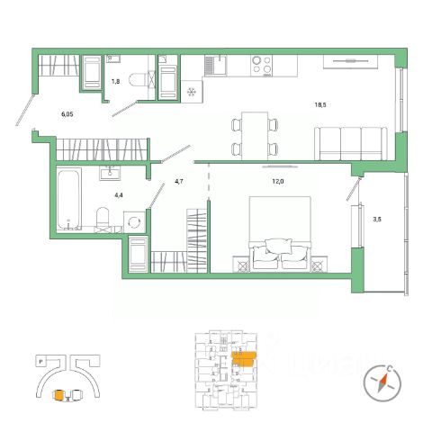 Квартира находится на 11-м этаже, есть застекленная, просторная лоджия.