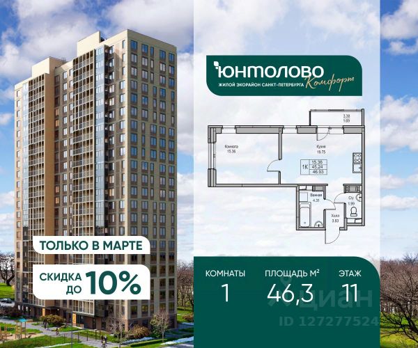 Продаeтся 1-к квартира 39.78 кв.м. экорайона "Юнтолово" (Приморский р-н) напрямую от застройщика "Главстрой Санкт-Петербург". Доступны льготная ипотека, рассрочка, трейд-ин и спецпредложения. Стоимость квартиры в объявлении указана со скидкой 10%. Cкидка прeдоcтавляется пpи 100% oплaтe или ипотeкe. Подробности уточняйте в отделе продаж. О проекте Жилой экорайон "Юнтолово" расположен в престижном Приморском районе, в живописной зелёной зоне недалеко от Юнтоловского заказника. На участке площадью 437 га планируется около 2,2 млн кв. м жилья с образовательной, медицинской, торговой, деловой инфраструктурой и общественными пространствами. Настоящее сердце "Юнтолово" — Центральный парк площадью 20 гектаров. Главная идея экорайона — близость к настоящей природе в черте города. Расположение и транспортная доступность Тишина и зелёное окружение района сочетаются с городской инфраструктурой и удобной логистикой. Остановки общественного транспорта до метро "Беговая", "Старая Деревня", "Комендантский проспект" и "Чёрная речка" в шаговой доступности. Близость КАД, ЗСД и Приморского шоссе обеспечивает быстрый выезд в центр, Курортный район и другие части города. Инфраструктура В парк-квартале "Юнтолово" создана вся необходимая социальная и коммерческая инфраструктура. Для детей открыты 4 современных детских сада и 2 школы. На первых этажах работают кафе и пекарни, магазины, аптеки, салоны красоты, МФЦ, почта России, развивающие центры для детей и другие сервисы. Для отдыха и спорта Особое внимание уделено качеству общественных пространств, формирующих среду для отдыха, общения и активного образа жизни. Для маленьких жителей организованы детские площадки с игровыми комплексами для всех возрастных групп. Для активного отдыха — уличные тренажёры, футбольные, волейбольные и баскетбольные поля, йога-зона, велодорожки, беговые маршруты и скейт-парк. На берегу реки Юнтоловки открыт гребной клуб "ПричалЮ" для любителей сапсёрфинга и гребли. Планировочные решения В "Юнтолово" предусмотрена широкая линейка планировок — от компактных студий 23 м² до семейных четырёхкомнатных квартир до 111 м² с мастер-спальнями, гостевым санузлом и системами хранения. Квартиры сдаются с чистовой отделкой "Комфорт" в светлом и темном решении. Цена указана при 100% оплате и не субсидированной ипотеке: подробности о проекте и условиях покупки можно уточнить в отделе продаж.