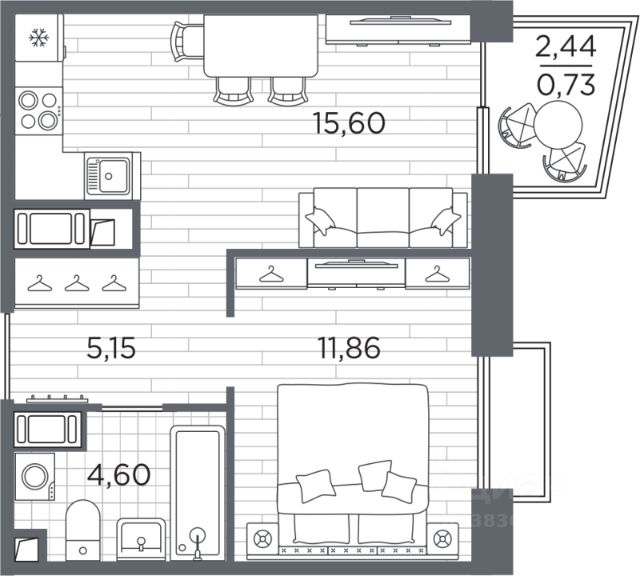 Планировка: прихожая, кухня, санузел (ванна), изолированная спальня/гостиная, гардеробная, лоджия.