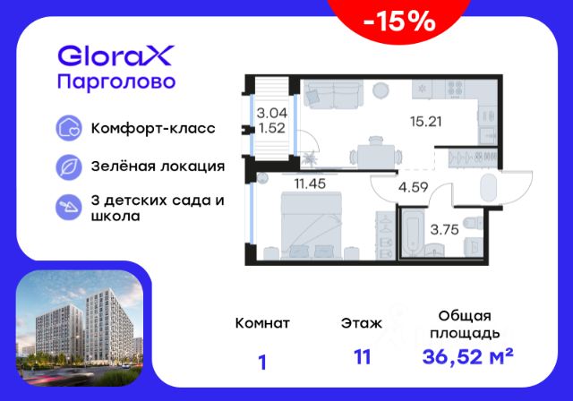 Продается 1-комн. квартира на 11-м этаже в проекте комфорт-класса GloraX Парголово. Общая площадь лота составляет 32,45 кв. м, из которых 10,15 кв. м отведено под жилую и 13,45 кв. м под кухонную зону. Номер квартиры - 100. Преимущества: - Квартира комфорт-класса с полной чистовой отделкой - Зеленый район, Шуваловский парк в 20 мин. пешком - 10 мин. до КАД, 15 мин. до ЗСД - 5 эт. паркинг на 451 м/м - Закрытые дворы с видеонаблюдением - Детские площадки с геопласткой и бизиборадми - Сады и школы в шаговой доступности - Спортивные площадки и велодорожки - Собственный комьюнити-центр - Келлеры для хранения - Коммерческие помещения на 1 этажах GloraX Парголово — масштабный проект комфорт-класса в Выборгском районе Санкт-Петербурга. Место, продуманное до мелочей, где все, что необходимо — рядом. Архитектурно-пространственное решение отличается лаконичностью и строгостью и придает проекту свой характер. Внутренние дворы закрыты от внешнего мира, создавая приватную территорию для жителей. Живите на природе, но с комфортом мегаполиса. Десять минут на велосипеде или полчаса пешком — и вы окажетесь в одном из культовых мест отдыха петербуржцев: Шуваловском парке, Орловском заказнике с их чистыми карьерами или на Суздальских озерах. До ж/д станции "Парголово" 7 минут на автомобиле, до метро Проспект Просвещения 25 минут, КАД 10 минут, ЗСД 15 минут. В шаговой доступности остановка общественного транспорта. В шаговой доступности — собственные школы и детские сады. Здесь все создано для максимального комфорта каждого жителя. Приватное пространство внутреннего двора с беседками с розетками для работы и отдыха, зеленый двор с уютным многоуровневым освещением, детскими эко-площадками и спортивными workout создает неповторимую атмосферу, заряжающую энергией на новые свершения. Квартиры сдаются с предчистовой отделкой White box, с возможностью дозаказа отделки в двух цветовых вариантах. Цена указана при 100% оплате или стандартной ипотеке. Узнайте подробности в Отделе продаж.