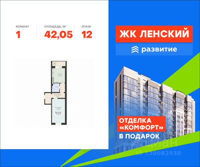 В продаже квартира площадью 42.05 кв. м без отделки на 12 этаже 16 этажного дома. Квартира находится в 4835 корпусе: Жилой комплекс "Ленский" - место, где встречаются природа и городская среда, а умиротворение загородной жизни сочетается с комфортом. Проект располагается на северо-востоке Санкт-Петербурга, в Южном микрорайоне Всеволожска, в 16 км от КАД, с удобным выездом на Колтужское шоссе и Дорогу Жизни. В его состав входят два 18-этажных корпуса с видами на Колтушские высоты, сервисы повседневной инфраструктуры, собственный приватный двор, просторный паркинг для жителей и гостей. Девелопер проекта - федеральный застройщик ГК "Развитие". Транспортная доступность На автомобиле: • 30 мин до станции метро "ул. Дыбенко" • 35 мин до центра Санкт-Петербурга Архитектура Архитектурный облик отличается современным дизайном. Панорамные окна с большой площадью остекления наполняют квартиры светом, актуальная финская технология Peikko защищает квартиры от промерзания даже в северном климате. Дома прочные, долговечные, их конструкция гарантирует тёплый микроклимат зимой, прохладу летом и отличную звукоизоляцию. Планировочные решения Функциональные планировки отличаются простотой и эргономичностью, пространство эффективно используется даже на небольшой площади. К кухне примыкает просторная лоджия с панорамным остеклением, во всех двух- и трехкомнатных квартирах - по два санузла. Все квартиры сдаются с отделкой white box, которая позволяет существенно сократить стоимость и сроки ремонта. По желанию доступны варианты чистовой отделки под ключ: "комфорт" и "бизнес" с использованием современных материалов. Благоустройство - приватный двор без машин; - всесезонное озеленение; - спортивный корт для футбола и баскетбола; - детские площадки с мягким покрытием; - площадка для настольного тенниса; - скамейки и беседки для отдыха по всему периметру; - прогулочные и велосипедные дорожки в тени деревьев; - сквозные парадные с большими окнами; - просторная входная группа на уровне земли; - колясочные помещения; - торговая галерея в шаговой доступности. Окружение - 5 парков: заповедник "Колтушские высоты", парк "Софиевка", "Румболовский", "Кенша", Державинский и Алексеевский парки. За 5-10 минут можно добраться транспортом до Песчанки и Петропавловского парка. Ковалевский лесопарк выделяется прекрасными экотропами, зонами для пикников и велодорожками, а Ждановские озера - благоустроенными пляжами; - рядом Колтушинский фреш-маркет с фермерскими продуктами и крупный ТЦ "Юбилейный", где работают более 70 магазинов, кинотеатр и фуд-корт; - 10 детских садов, начальная и средняя школы, центры дополнительного образования, творческие секции; - в ближайшей доступности фитнес-центры, бассейн, теннисный клуб и даже центр верховой езды; - культурные и знаковые места: Музей-усадьба "Приютино", музей "Дом Авиаторов", мемориальный комплекс "Дорога Жизни", многочисленные пешеходные маршруты.