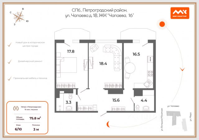 Уютная видовая квартира в престижной части Петроградского района Санкт-Петербурга от строительной компании ЛСР. Дом в ЖК Европа-Сити с закрытой территорией и круглосуточной охраной. Развитая инфраструктура : салоны красоты, магазины, кафе, рестораны, супермаркеты и многое другое в шаговой доступности. До метро Петроградская всего 10 минут пешком. Представьте место,где утром вы просыпаетесь от мягкого света, выходите на просторную кухню-гостиную 18:65 м2, ставите кофе и с чашкой в руках смотрите на историческую часть Петроградской стороны. Что делает эту квартиру особенной? Конечно же видовые характеристики. Смотрите фото, а лучше приходите на просмотр. Полная готовность к проживанию . В квартире делался качественный дизайнерский ремонт, где использовались дорогостоящие материалы. Комфортный 12 этаж., все окна выходят на историческую часть Петроградской стороны. Эта квартира - идеальный выбор для тех, кто ценит стиль, комфорт и романтику в каждом дне. Лучшая квартира ждёт своего счастливого владельца . Транспортная доступность: До станции петроградская 10 минут пешком. Инфраструктура. В пешей доступности десятки стильных ресторанов, магазинов, кафе и супермаркетов. В районе есть лучшие гимназии и лицее, а также университеты. В договоре купли-продажи указываем полную стоимость квартиры