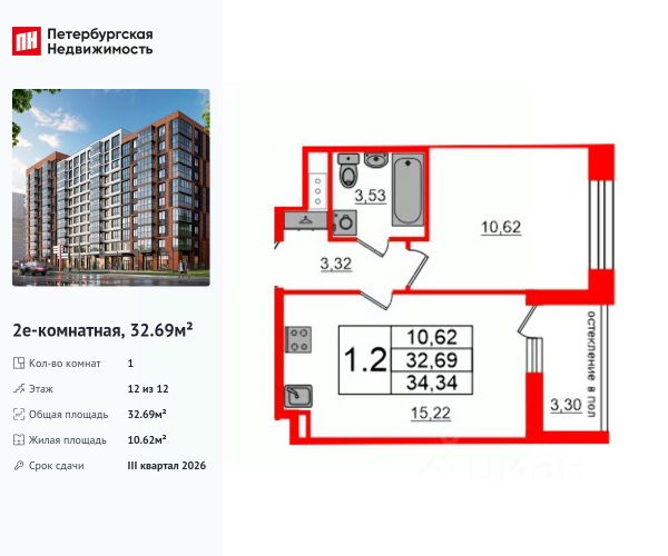 Продаётся 1-комн. квартира площадью 46,2 кв.м на 12 этаже 12 этажного дома (Корпус 4.1, Секция 1) проекта ПИК Таллинский парк. Светлый просторный подъезд на уровне земли, функциональная планировка, большие окна, без отделки. "Таллинский парк" - проект в Ленинградской области, в районе Новоселье. До станции метро "Проспект Ветеранов" - 15 минут на автомобиле, а до КАД можно доехать всего за 4 минуты. "Таллинский парк" включает 16 жилых домов, детский сад и школу. В проекте появится центральный сквер с обильным озеленением, а через весь квартал протянутся широкие пешеходные бульвары. В зелёных дворах-парках будут оборудованы современные детские и спортивные площадки, обустроены места для отдыха. На первых этажах разместятся магазины, кафе и другие сервисы. Проектом предусмотрены персональные кладовые помещения - это доступный, экономичный и удобный способ хранения сезонных и крупногабаритных вещей. Освободите свою квартиру для полноценной жизни. Район Новоселье активно развивается в городском формате: здесь уже работают детские сады, школа и магазины. Для любителей зимних видов спорта открыта круглосуточная ледовая арена Ice Rink. За покупками и развлечениями также можно быстро доехать: 10 минут - и вы в Аутлете Fashion House Таллинское, гипермаркетах Лента, Леруа Мерлен и Окей. В 10 минутах на автомобиле находится Финский залив, на берегу которого расположились объекты культурного наследия. Рядом - Константиновский парк с отреставрированным дворцом, а чуть дальше расположена усадьба Знаменка. В великолепном Петергофе вы будете уже через 20 минут. Артикул 1026281 (Застройщик ООО "СПЕЦИАЛИЗИРОВАННЫЙ ЗА СТРОЙЩИК "СТРОЙ-ЭКСПЕРТ ") [cn_sbp_1807066]