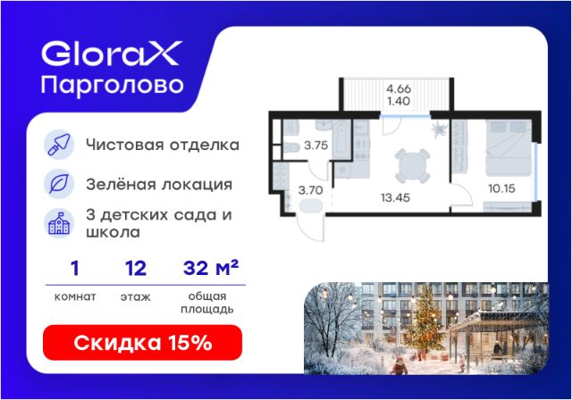 Продается 1-комн. квартира на 12-м этаже в проекте комфорт-класса GloraX Парголово. Общая площадь лота составляет 32,42 кв. м, из которых 10,15 кв. м отведено под жилую и 13,45 кв. м под кухонную зону. Номер квартиры - 243. Преимущества: - Квартира комфорт-класса - Зеленый район, Шуваловский парк в 20 мин. пешком - 10 мин. до КАД, 15 мин. до ЗСД - 5 эт. паркинг на 451 м/м - Закрытые дворы с видеонаблюдением - Детские площадки с геопласткой и бизиборадми - Сады и школы в шаговой доступности - Спортивные площадки и велодорожки - Собственный комьюнити-центр - Келлеры для хранения - Коммерческие помещения на 1 этажах GloraX Парголово — масштабный проект комфорт-класса в Выборгском районе Санкт-Петербурга. Место, продуманное до мелочей, где все, что необходимо — рядом. Архитектурно-пространственное решение отличается лаконичностью и строгостью и придает проекту свой характер. Внутренние дворы закрыты от внешнего мира, создавая приватную территорию для жителей. Живите на природе, но с комфортом мегаполиса. Десять минут на велосипеде или полчаса пешком — и вы окажетесь в одном из культовых мест отдыха петербуржцев: Шуваловском парке, Орловском заказнике с их чистыми карьерами или на Суздальских озерах. До ж/д станции "Парголово" 7 минут на автомобиле, до метро Проспект Просвещения 25 минут, КАД 10 минут, ЗСД 15 минут. В шаговой доступности остановка общественного транспорта. В шаговой доступности — собственные школы и детские сады. Здесь все создано для максимального комфорта каждого жителя. Приватное пространство внутреннего двора с беседками с розетками для работы и отдыха, зеленый двор с уютным многоуровневым освещением, детскими эко-площадками и спортивными workout создает неповторимую атмосферу, заряжающую энергией на новые свершения. Квартиры сдаются без отделки. Цена указана при 100% оплате или стандартной ипотеке. Узнайте подробности в Отделе продаж.