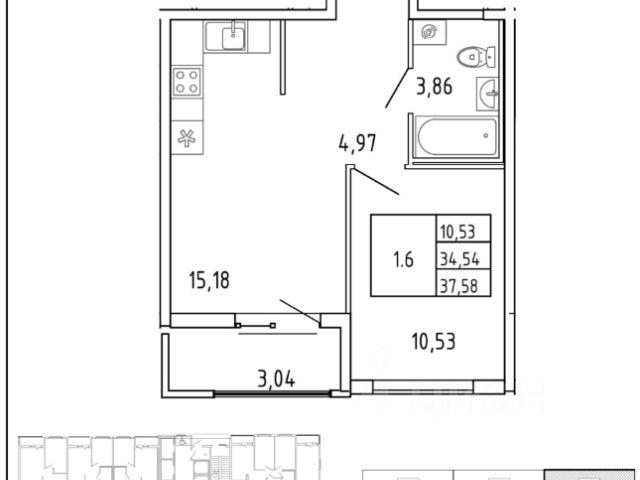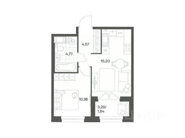 - Удачная двусторонняя планировка, в которой выделена зона кухни-гостиной и спальни (при желании, вы сможете преобразовать апартамент в полноценную однокомнатную квартиру).